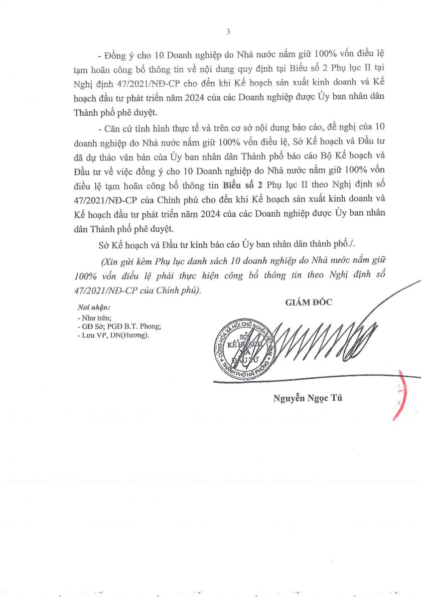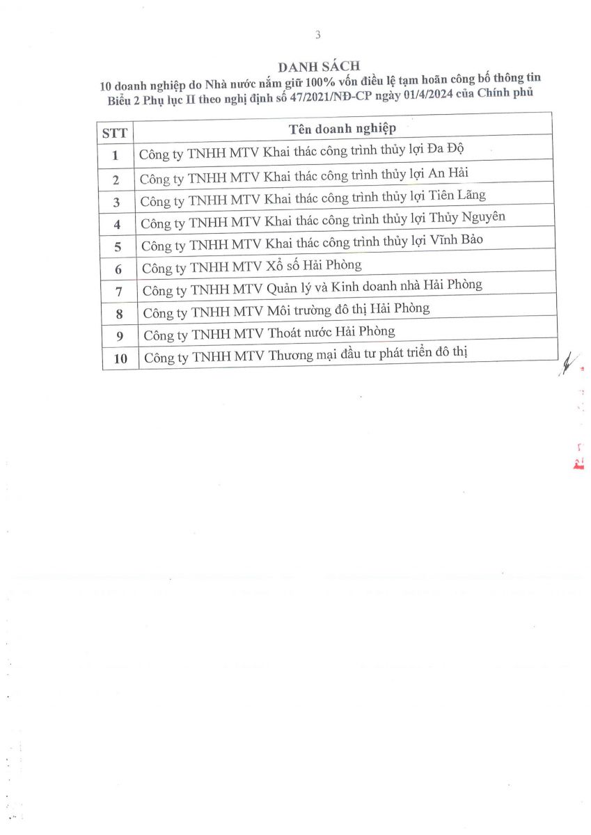 V/v tạm hoãn công bố thông tin của 10 doanh nghiệp do Nhà nước nắm giữ 100% vốn điều lệ theo quy định của Nghị định số 47/2021/NĐ-CP của Chính phủ