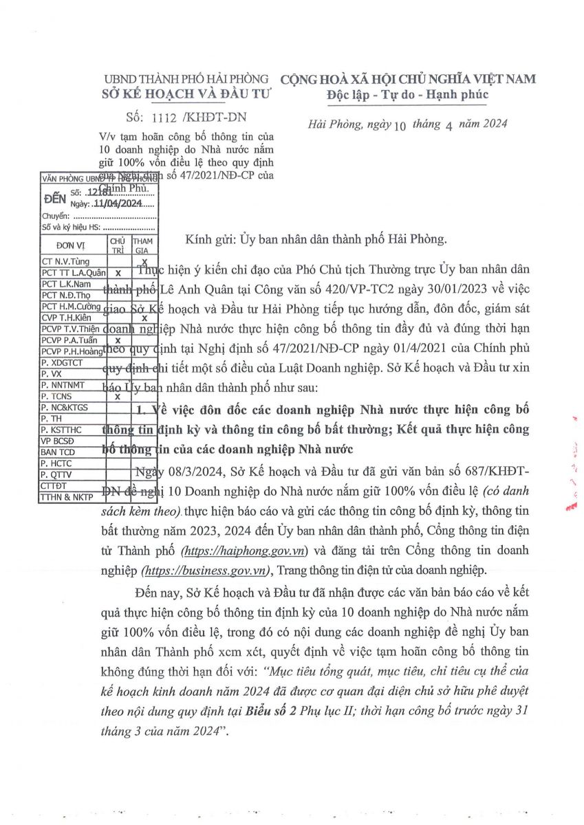 V/v tạm hoãn công bố thông tin của 10 doanh nghiệp do Nhà nước nắm giữ 100% vốn điều lệ theo quy định của Nghị định số 47/2021/NĐ-CP của Chính phủ