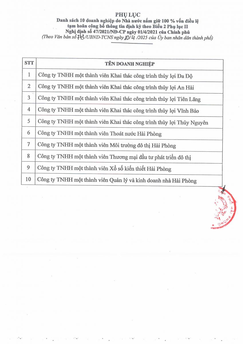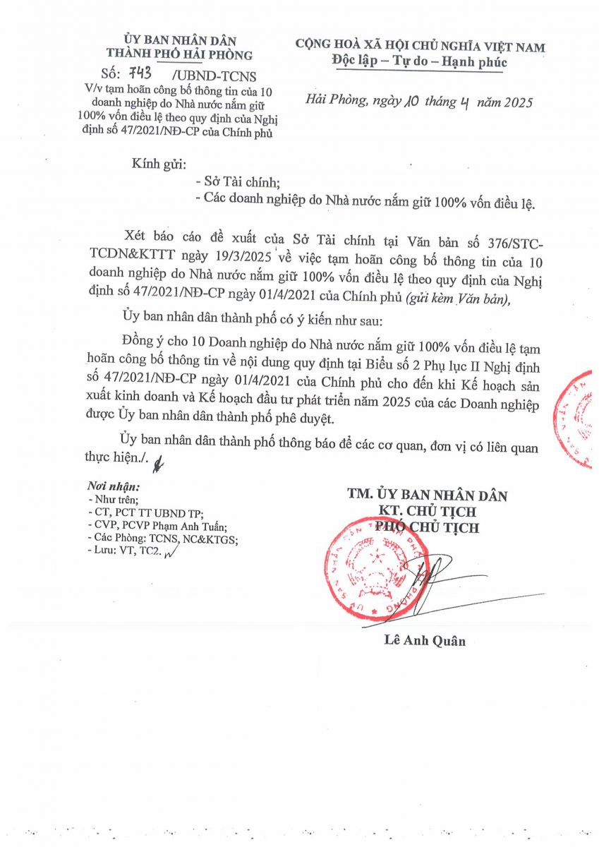 Công văn số 743/UBND-TCNS ngày 10/4/2025 của UBND Thành phố Hải Phòng "V/v tạm hoãn công bố thông tin của 10 doanh nghiệp do Nhà nước nắm giữ 100% vốn điều lệ theo quy định của Nghị định số 47/2021/NĐ-CP của Chính phủ"