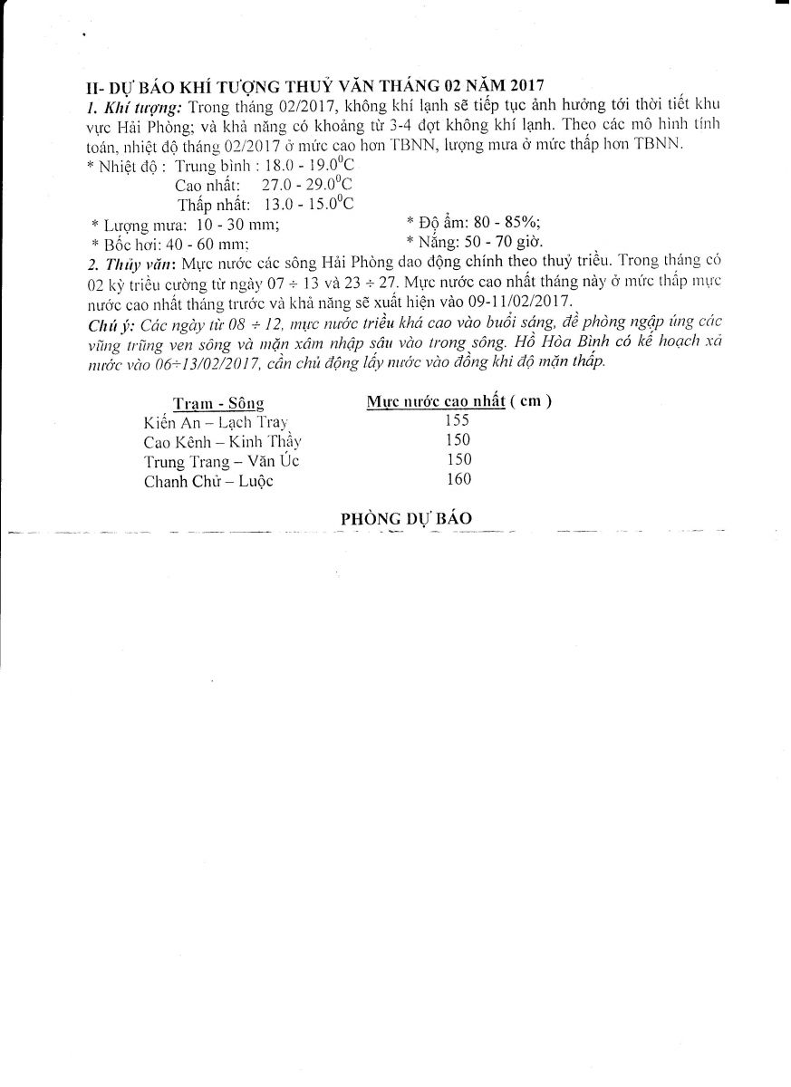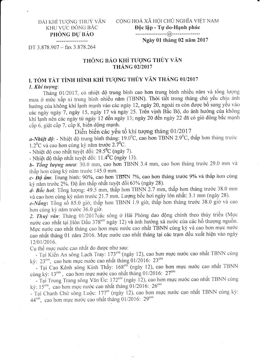 THÔNG BÁO KHÍ TƯỢNG THỦY VĂN THÁNG 02/2017